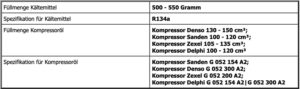 | Füllmenge R134a: 500-550 Gramm |